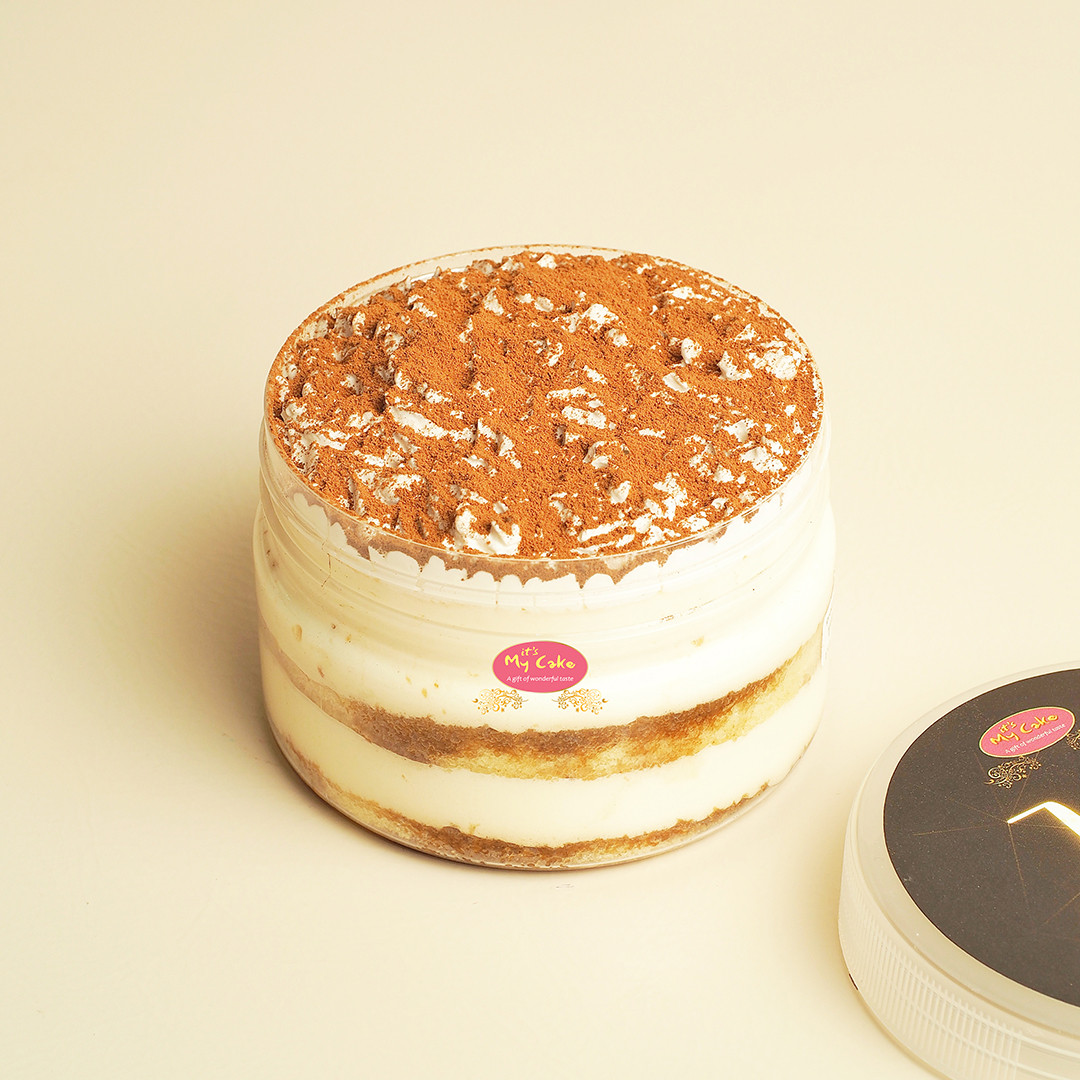 Sponge cake doused with Robusta coffee liquid, cream cheese mousse, in each layer, decorated with whipped cream, sprinkled with cocoa powder. Stored in the freezer, please serve cold for a better taste.