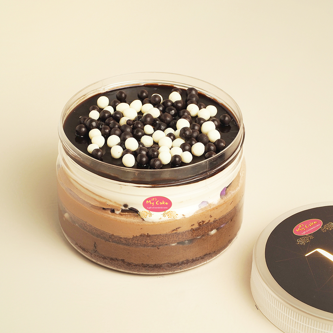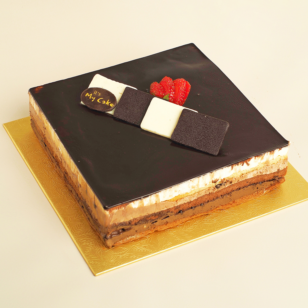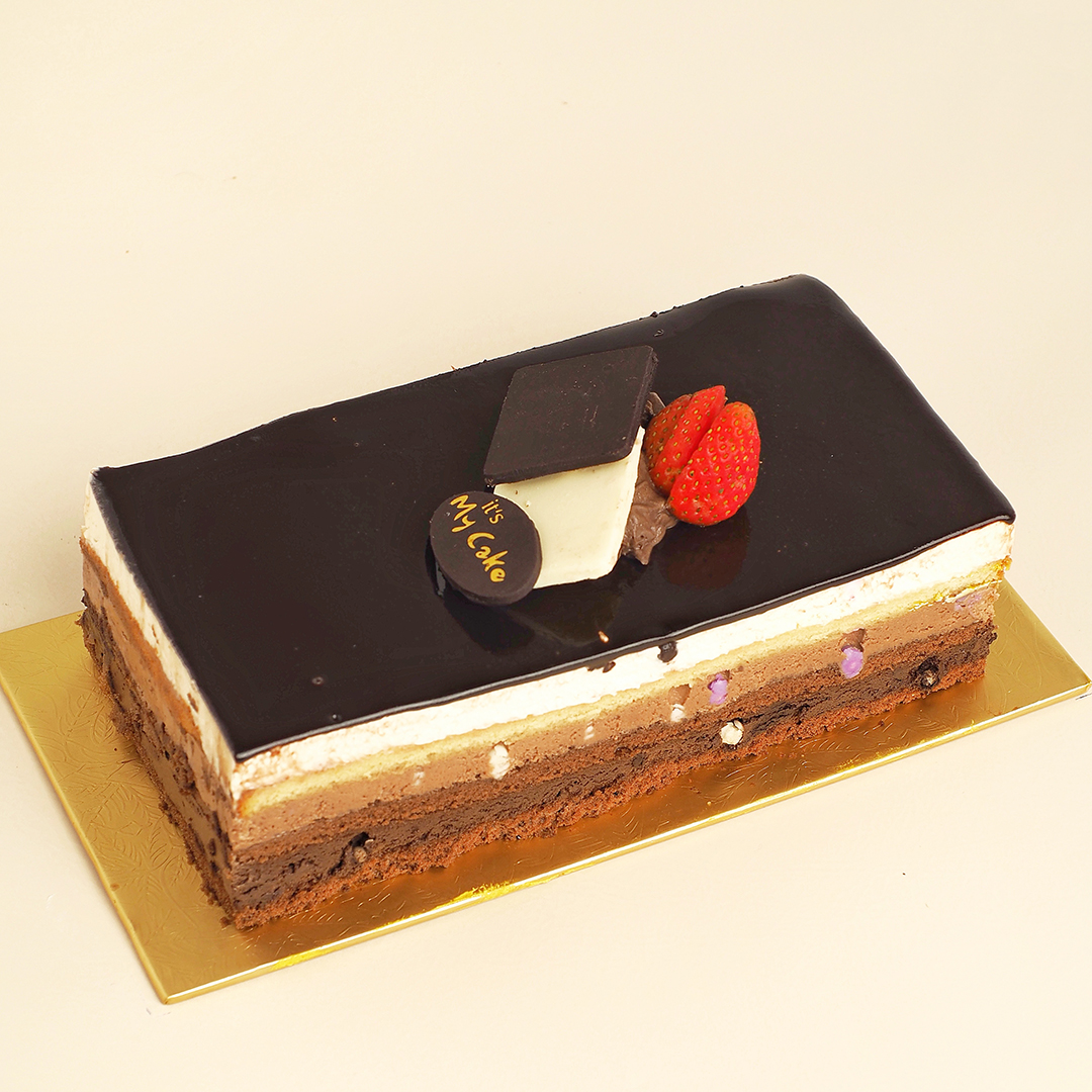 Sponge cake with, three layers of dark, milk & white chocolate mousse and crispy balls of three flavors in each layer, decorated with mirror chocolate topping. Stored in the freezer, please serve cold for a better taste.