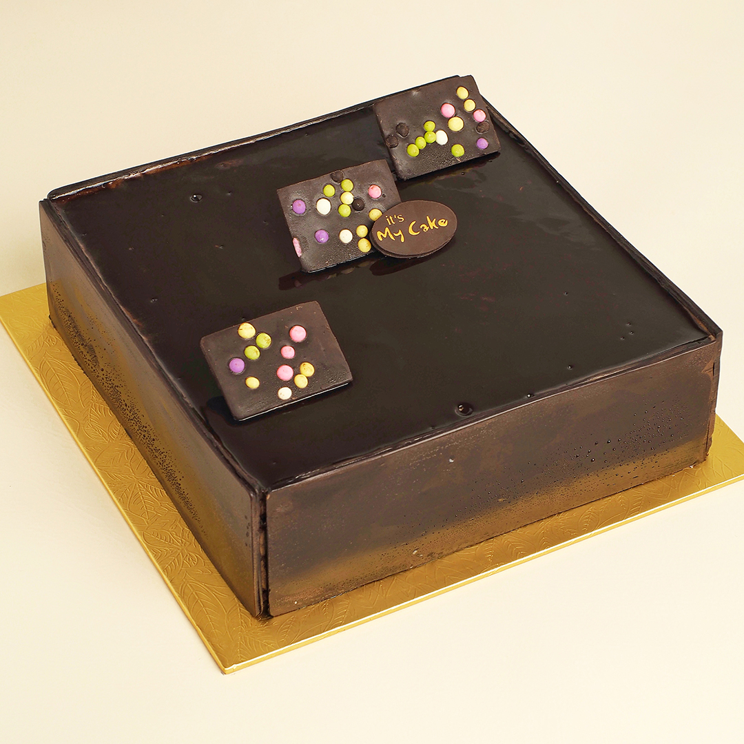 Chocolate sponge cake, special chocolate milk mousse and colorful crispy balls in each layer, decorated with dark chocolate compound, and topped with mirror chocolate. Stored in the freezer, please serve cold for a better taste.